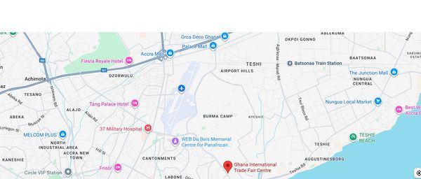 The Trade Fair Centre is located between the Accra city centre and the seaport of Tema. It lies about 200 meters from the main beach road connecting Ghana's administrative and industrial metropolitan area. It is easily accessible from both directions.